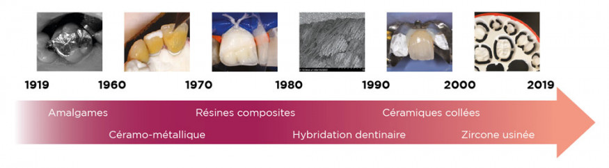 La première révolution concerne l’avènement des amalgames dentaires apparus à la fin du XIXe siècle qui ont permis la généralisation des restaurations directes selon les principes de Black. Si leur composition a peu changé jusqu’aux années 60, l’élévation de leur teneur en cuivre dans les années 70 a considérablement amélioré les propriétés de l’amalgame qui fut le matériau de restauration direct de toute la première moitié du siècle passé. Bien que leurs performances cliniques soient reconnues, ils sont désormais progressivement abandonnés, voire interdits, au profit des matériaux plus esthétiques, ainsi que pour des considérations écologiques liées à l’emploi du mercure.