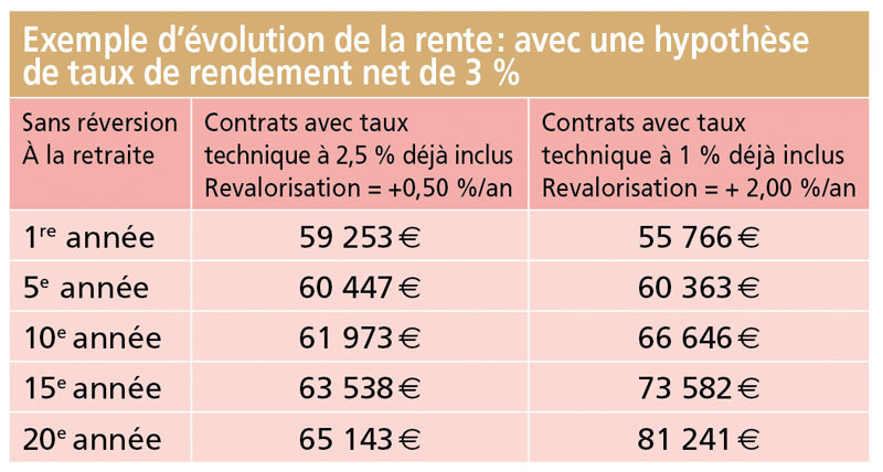 Les frais techniques. Il faut être particulièrement vigilant à ce sujet. Le taux d’intérêt technique, faussement appelé taux minimum garanti, est un taux d’intérêt précompté par les organismes d’assurances et les banques permettant de calculer de manière virtuelle votre rente à la retraite. Plus ce taux est élevé, plus la rente prévisible semble importante. Mais en contrepartie, plus ce taux est élevé, moins la rente sera revalorisée pendant votre retraite. Avec un rendement net de 3 % et un taux d’intérêt technique (déjà inclus dans le calcul de la rente) de 2,5 %, la rente ne sera revalorisée que de 3 % – 2,5 % = 0,5 %.