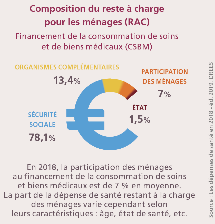 En 2018, le reste à charge des ménages baisse encore. Il s’établit à 7 % de la CSBM, après 7,5 % en 2017 et 7,7 % en 2016. Logique, puisque la part des dépenses prises en charge par l’Assurance maladie a progressé, tout comme celle des organismes complémentaires. C’est + 0,2 point à 78,1 % pour l’assurance maladie du fait, selon la Drees, de « la forte progression du nombre de patients pris en charge à 100 % au titre des affections de longues durées (ALD) » (vieillissement de la population) et 0,3 point pour les complémentaires santé en raison d’une « meilleure prise en charge de l’optique et des soins dentaires à la suite de la généralisation de la complémentaire d’entreprise initiée en 2016 ». La participation directe des ménages aux dépenses de santé s’élève à 14,3 milliards d’euros en 2018, soit, en moyenne, 214 € par habitant et par an, montant qui varie selon les profils : âge, état de santé, etc. C’est le reste à charge le plus faible des pays de l’OCDE.