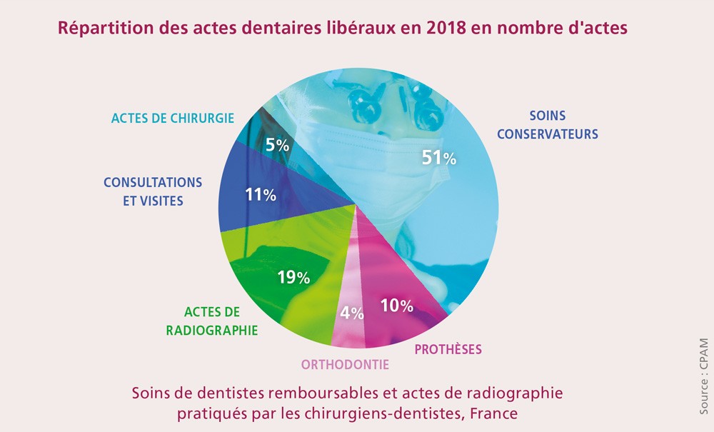 En 2018, la consommation de soins dentaires (consultations, soins prothétiques, prothèses, détartrage, etc.) s’élève à 11,4 milliards d’euros, soit +1,4 % sur un an contre + 1,8 % en 2017 et + 3,0 % en 2016, en raison principalement d’un ralentissement des volumes de soins (+ 0,7 % contre + 1,3 % en 2017). « Néanmoins, la dynamique réelle de la consommation de soins dentaires est difficile à appréhender, du fait de la difficulté de mesurer finement les soins non remboursables », note la Drees. Les soins dentaires représentent 5,6 % de la CSBM et contribuent à hauteur de 0,1 point seulement de sa croissance. Parmi les soins remboursables, les soins conservateurs représentent 51 % du nombre total d’actes. Viennent ensuite les radiographies (19 %), les consultations (11 %), les prothèses (10 %), les actes de chirurgie (5 %) et enfin l’orthodontie (4 %). La Drees ne donne pas la composition en termes de soins facturés. La prothèse y tiendrait le premier rôle.