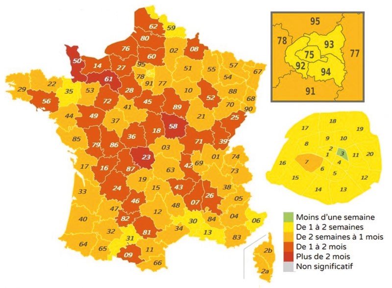 Les disparités sont marquées entre spécialités, mais aussi d’un département à l’autre. En cardiologie par exemple, il faut 53 jours en moyenne pour décrocher un rendez-vous, mais 201 jours en Vendée et 155 dans le Lot-et-Garonne. Pour les chirurgiens-dentistes, selon le site internet, il faut patienter 81 jours dans la Creuse, 77 dans la Nièvre, 69 dans la Manche, 66 dans l’Orne et 60 dans la Somme. Autant de départements où la densité professionnelle est très faible. Ailleurs, le temps d’attente ne dépasse pas les deux mois.