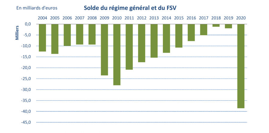Le solde du régime général de la sécurité sociale et du fonds de solidarité vieillesse (FSV), s’établit pour 2020 à – 38,6 milliards d’euros (Md€), en dégradation de 36,6 Md€ par rapport à 2019 (il avait enregistré un déficit de 1,9 Md€). « Cette dégradation brutale et sans précédent, conséquence de la crise sanitaire et économique, conduit au déficit le plus élevé jamais enregistré dans l’histoire de la sécurité sociale », souligne un communiqué du ministère de la Santé le 15 mars. Le précédent plus bas, – 28,0 Md€, avait été atteint en 2010 après la crise financière de 2008.