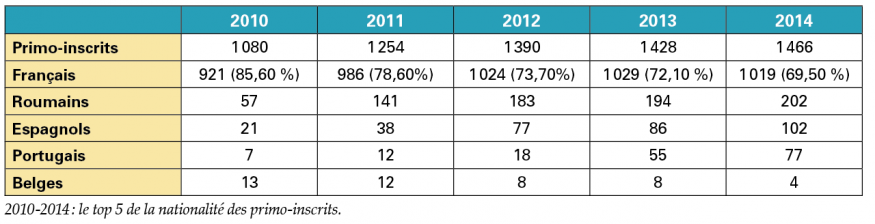 S’agissant des primo-inscrits de nationalité « communautaire », les Roumains et les Espagnols s’installent de plus en plus nombreux dans notre pays (voir ci-dessus). En 2010, on comptait 57 praticiens roumains ; ils étaient presque trois fois plus nombreux en 2011 (141 praticiens), ils étaient 194 en 2013, ils sont 202 en 2014. Idem pour les praticiens espagnols : 38 en 2011, plus du double en 2012 (77 praticiens), 86 en 2013 et 102 en 2014. Globalement, le nombre de nouveaux inscrits est en progression : plus 38 chirurgiens-dentistes par rapport à 2013.