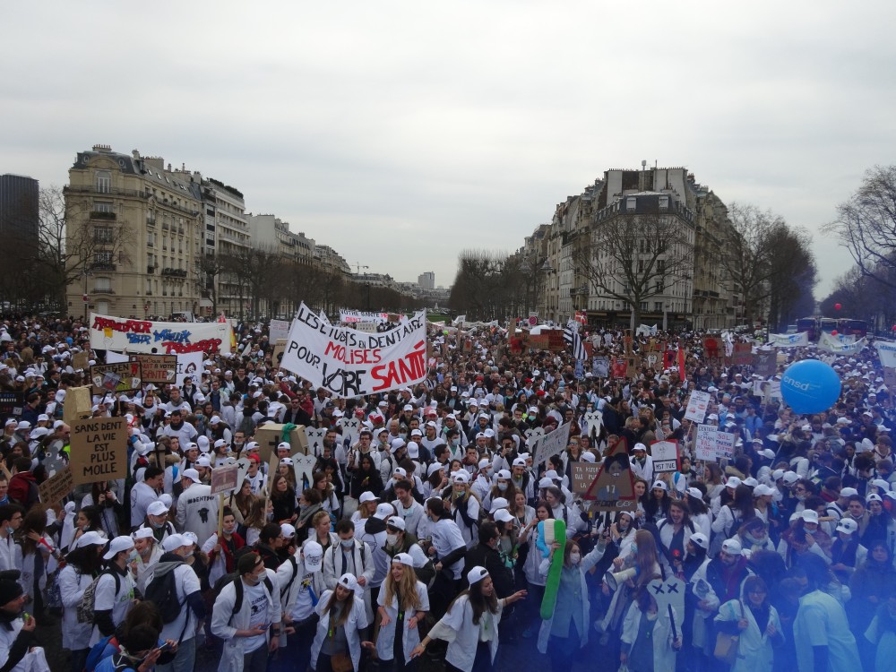 Au moins 10 000 chirurgiens-dentistes, étudiants, internes, enseignants, assistantes dentaires, prothésistes et représentants de l’industrie se sont rassemblés ce vendredi à Paris, place Vauban, à proximité du ministère de la Santé, pour protester contre l’arbitrage mis en place par Marisol Touraine après l’échec des négociations conventionnelles le 26 janvier. Sono, sifflets, cornes de brume, fumigènes, pétards et fanfare… l’ambiance était plutôt bon enfant.