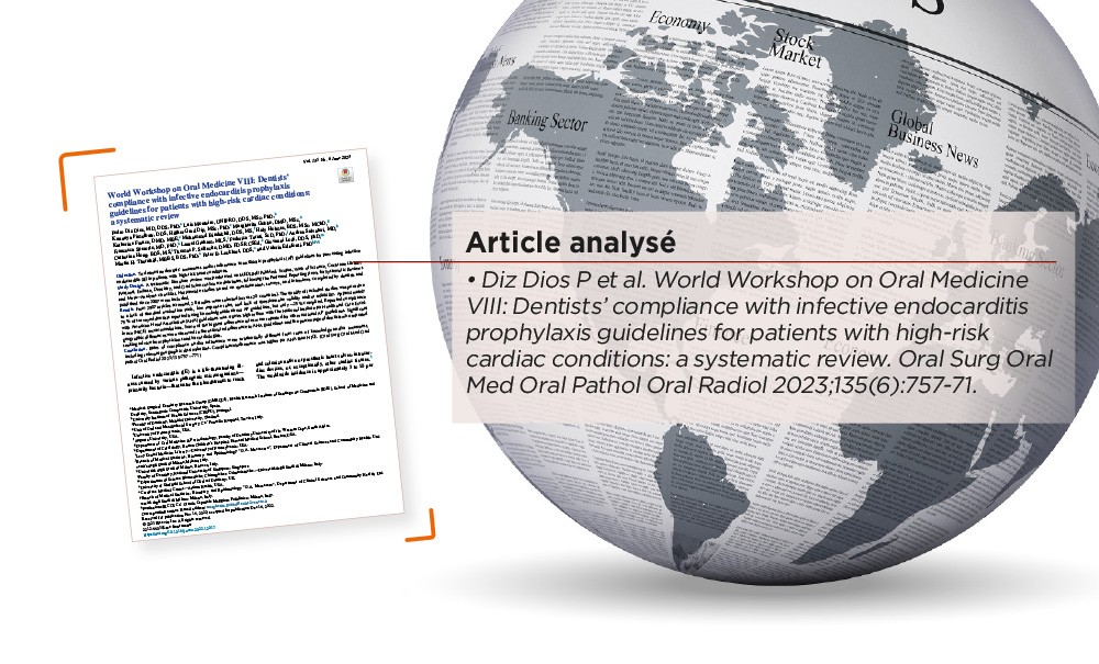 L’endocardite infectieuse (EI) est une maladie potentiellement mortelle causée par divers micro-organismes pathogènes, principalement des bactéries, qui pénètrent dans la circulation sanguine et colonisent les valves cardiaques natives ou prothétiques, les dispositifs intracardiaques ou, exceptionnellement, d’autres tissus cardiaques. L’EI est associée à une morbidité importante (40 à 50 % des patients nécessitant une chirurgie valvulaire) et à une mortalité d’environ 20 à 25 % pendant la première année. Les actes invasifs bucco-dentaires sont responsables d’une bactériémie à Streptococcus viridans et représentent une cause importante d’EI.