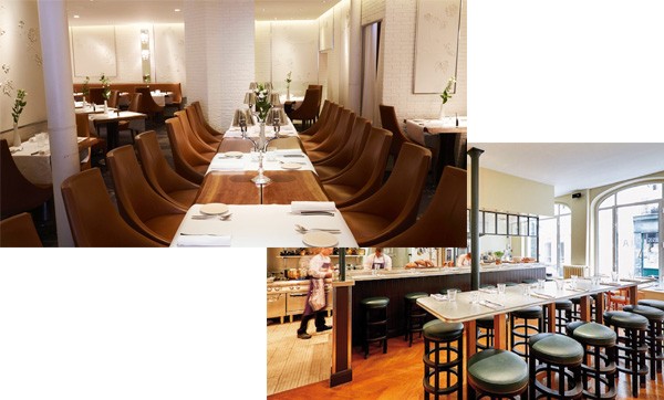 Cadre : au cœur du 2e arrondissement, c’est dans un immeuble construit à la fin du XIXe siècle, à la façade de belle prestance, que vient de s’ouvrir le nouveau restaurant d’Hélène Darroze, sur deux niveaux. Au rez-de-chaussée, une grande salle lumineuse avec au centre une longue table d’hôtes avec de hauts tabourets comme pour un comptoir, au plus près de la cuisine ouverte sur la salle. On accède au 1er étage par un majestueux escalier à la rampe en acier peint débouchant sur un bar lounge élégant et cossu.