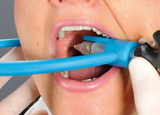 Le tube de guidage est placé contre les faces occlusales des dents maxillaires entre la deuxième prémolaire et la première molaire opposées au côté à injecter. Il s’utilise uniquement avec des aiguilles de longueur 35 mm et de diamètre 0,5 mm.