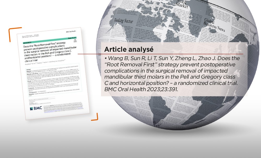 Dans cet essai contrôlé randomisé sur 274 patients (127 hommes, 147 femmes, âgés entre 18 et 55 ans) présentant une troisième molaire en position horizontale profondément incluse (classe C de la classification de Gregory et Pell), les auteurs ont comparé l’intérêt de l’avulsion première des racines avant la couronne sur la survenue de complications locales au niveau de la deuxième molaire adjacente et du nerf alvéolaire inférieur. Ainsi, dans le groupe expérimental (n = 137), les troisièmes molaires étaient avulsées via une voie d’abord réalisée à la hauteur de la jonction corono-radiculaire de la dent (puis élargie distalement si nécessaire). Après séparation corono-radiculaire, les racines étaient avulsées en premier puis la couronne dans un second temps, à travers l’espace libéré par les racines. Cette technique permettait ainsi de préserver un bandeau osseux intact tout autour de la deuxième molaire adjacente. Dans le groupe contrôle (n = 137), les troisièmes molaires étaient avulsées selon une approche dite « conventionnelle », à…