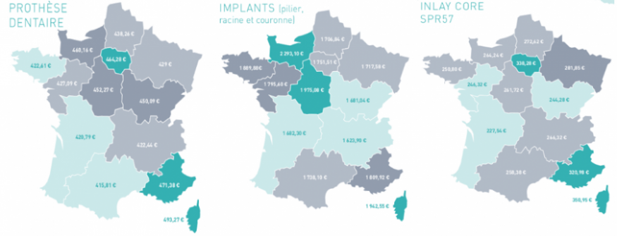 En fonction des régions, la dépense moyenne est comprise entre 420 et 493 € pour la prothèse, 227 et 350 € pour l’inlay-core (SPR 57) et entre 1 623 et 2 293 € pour les implants.