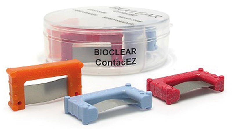 Le système est complété par les Interproximators et les scies-strip ContacEZ. Les premiers sont des coins interdentaires en silicone de deux consistances (souple et ferme) pour l’adaptation parfaite des matrices sectionnelles anatomiques translucides Bioclear au niveau des surfaces proximales des dents antérieures, et occasionnellement au niveau des secteurs postérieurs.