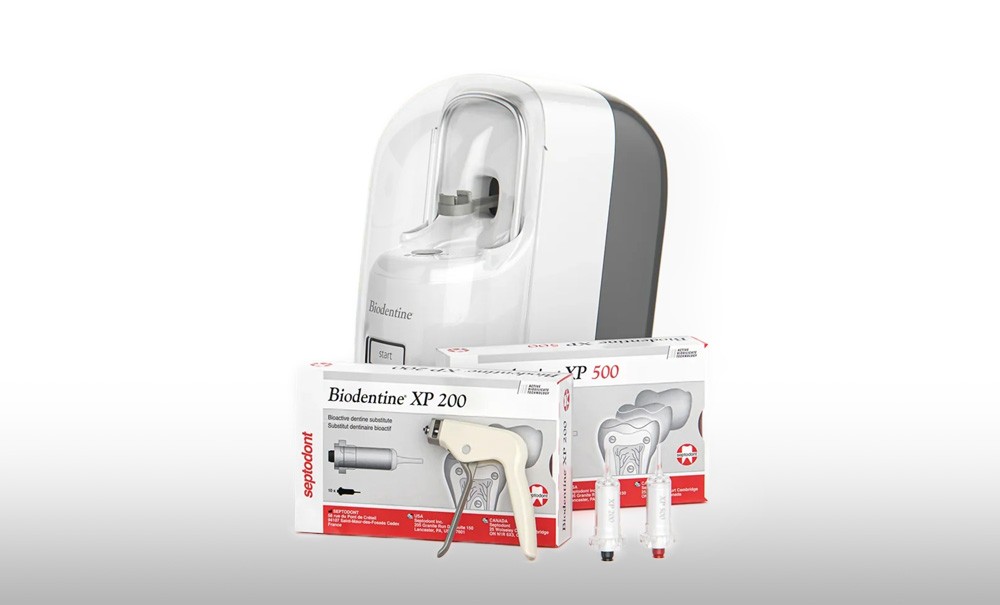 Les propriétés bioactives élevées de Biodentine (substitut dentinaire breveté, composé majoritairement de silicate tricalcique pur) permettent la formation d’hydroxyapatite et contribuent à conserver la vitalité pulpaire. Sa biocompatibilité réduit le risque de réaction tissulaire et pulpaire. On pouvait cependant lui reprocher sa difficulté à mélanger et à appliquer. Aujourd’hui, le protocole est simplifié par l’incorporation de la molécule de Biodentine, en tout point identique à l’originale, dans une cartouche.