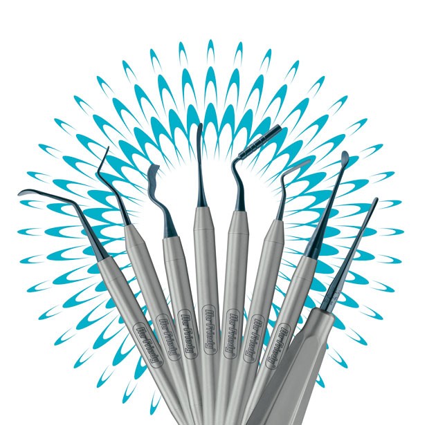 La série comprend notamment des curettes chirurgicales, des couteaux et des instruments pour l’élévation du plancher du sinus.
