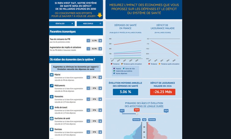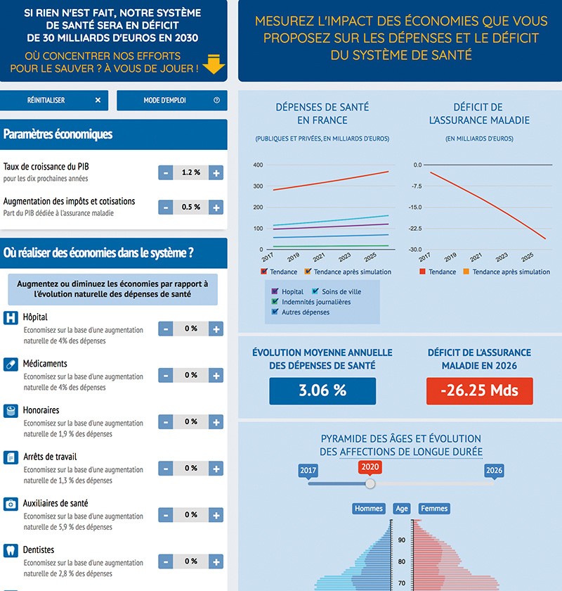 Si rien n’est fait, notre système de santé sera en déficit de 30 milliards d’euros en 2030 contre 26 aujourd’hui. Qui devra faire des efforts, où couper dans les dépenses ? Vous verrez les résultats de vos choix s’afficher immédiatement sous forme de graphique (comparé à celui prévu par le gouvernement). Pas si simple…