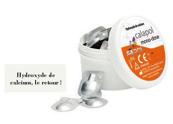 Troisième voie proposée par Apol qui propose, en plus d’une belle allitération, un hydroxyde de calcium en phase aqueuse conditionné en doses individuelles. Il s’agit plus précisément de capsules réalisées en composé alumino-plastique dont la parie supérieure, aisément déchirable, permet de prélever le matériau, à l’aide d’un lentulo ou d’une pointe en papier, au souhait de chacun. La consistance de crème fraîche liquide est correcte et reste identique de la première à la dernière capsule. La mise en œuvre au lentulo est aisée, la consistance de gel permet de faire glisser le matériau simplement en inclinant la tête du contre-angle, après avoir vérifié le sens de rotation bien entendu…