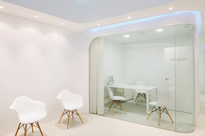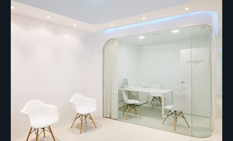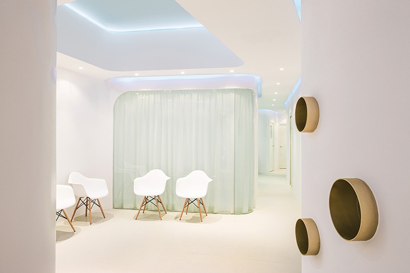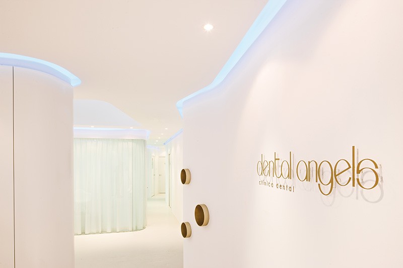 Les objectifs du projet Dental Angels étaient la réalisation d’« une image singulière, élégante tout en étant accessible, professionnelle et fraîche. Les volumes devaient être spacieux et lumineux, l’ambiance chaleureuse et confortable… Le blanc a été choisi comme couleur de base, puis des accents d’or et de bleu clair ont été ajoutés par des éléments tels que l’image de marque, la signalétique, les modules cylindriques ou la lumière indirecte linéaire à LED RGB. Les matériaux ou les finitions, intemporels, tels que la laque satinée blanche, les panneaux stratifiés du mobilier de la clinique et les revêtements de sols clairs sont combinés avec des surfaces qui ajoutent légèreté et chaleur, comme l’or satiné. »