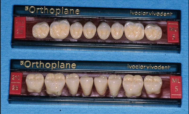 – les montages : dans tous ces cas complexes, l’occlusion bilatéralement équilibrée doit être systématiquement établie. L’utilisation de dents artificielles à morphologie occlusale plane sera privilégiée pour diminuer les composantes horizontales déstabilisantes (fig. 2) ;