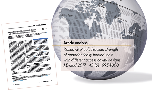 Qu’elle soit traumatique, liée à la carie ou aux procédures thérapeutiques de préparations coronaires, la perte de substance coronaire constitue le principal facteur de fragilisation de la dent, pulpée ou dépulpée. La réalisation d’une cavité d’accès endodontique (CAE) conduit de facto à un sacrifice tissulaire destiné à permettre aux instruments endodontiques d’accéder aux canaux pour les opérations de parage, de désinfection et d’obturation canalaire. Les CAE traditionnelles visent à la mise de dépouille de la chambre pulpaire jusqu’à permettre la libre pénétration des limes endodontique dans tous les canaux sans contraintes. Les auteurs de cette étude nous rappellent que ces principes n’ont que très peu évolué depuis des décennies et que la quantité de dentine saine éliminée pour aménager la CAE augmente la déformabilité de la dent sous contrainte et, par conséquent, sa résistance à la fracture.