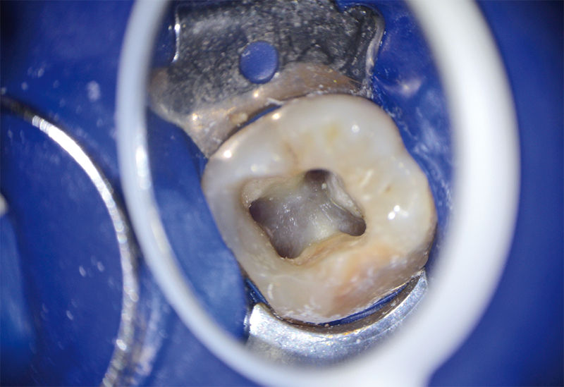Afin d’optimiser la réalisation d’une CAE, l’orientation coronaire doit être considérée en priorité pour guider l’axe de trépanation. Une mesure sur radiographie de la hauteur entre la surface occlusale et le plafond pulpaire donne une indication utile de la profondeur de trépanation attendue. L’ouverture de la cavité d’accès doit se faire a minima à l’aide d’une fraise à extrémité non travaillante (type Zekria Endo Z) jusqu’à visualisation des canaux et pénétration des instruments sans contrainte. La mise de dépouille complète n’est plus recommandée pour des raisons évidentes d’économie tissulaire.