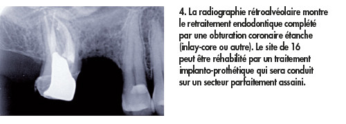 Ce choix thérapeutique souvent considéré comme une intervention de dernier recours est aussi indiqué en cas d’échec à la reprise de traitement. Il convient d’effectuer un choix judicieux entre l’option du retraitement conventionnel et celle d’une chirurgie d’emblée.