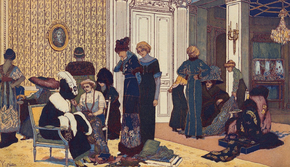 Les planches de Gatier semblent faites pour illustrer un manuel de maintien. La gestuelle y est toujours non pas guindée, ou corsetée à l’excès, mais très maîtrisée, dictée par le souci de bien se tenir en tout lieu avec la décence et la prudence qui siéent à l’élégance. Si l’effervescence règne sur l’hippodrome, elle n’affecte pas les spectatrices dont les mains savent garder contenance, prendre appui sur l’ombrelle, serrer gants et sac et prévenir toute saute de vent indélicat. Au salon de couture, ces mains expriment l’embarras du choix ou la sûreté de la dame en position de juger, tandis que d’autres font l’article, se retiennent de tomber devant l’indécision de la cliente ou, retirées dans le dos, tâchent de lui cacher une impatience qui ne serait pas de mise. Toujours dans un arrière-plan discret, cette fine psychologie se tient à sa place elle aussi et ne fait pas de Pierre Gatier un Marcel Proust de la peinture du temps et de ses mœurs. Mais elle séduit Doucet et son bras droit Alfred Vuaflart, associé à sa Société d’Iconographie Parisienne, qui voient, autant que son talent, la valeur historique des témoignages de ce nouveau « peintre de la vie moderne » et le poussent à synthétiser dans un traité ses recherches sur la gravure. Aucun des trois a-t-il décelé à cet instant que le vrai don de ce modeste modiste du chic était de comprendre que l’apparence suffit à créer l’illusion prise pour réalité, que ce qui satisfait l’œil a le pouvoir de le tromper et que ce qui est donné à voir au premier plan retarde sinon oblitère la perception des seconds ? Les différents niveaux de lecture que révèle une étude en profondeur de ses aquatintes autorisent à le penser. Mais un autre art va le confirmer, celui de la guerre.