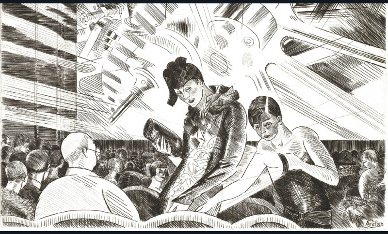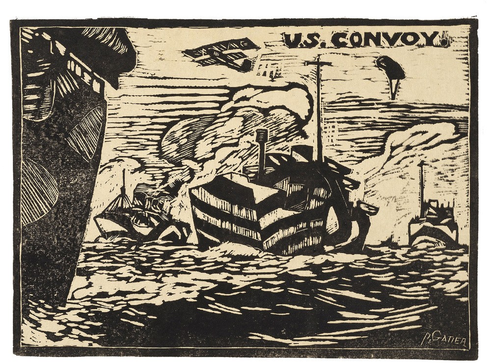 On n’attendait pas sur cette passerelle le futur habitué des défilés de mode. Mais c’est bien sur des navires de guerre qu’a embarqué Pierre Gatier dès 1907, en tant que peintre de la marine. C’est d’abord une affaire de famille : il a passé toute son enfance dans les ports militaires où s’étaient distingués ses père et grand-père. Cet exercice à l’air du large lui ouvre des horizons et lui permet de brasser les techniques : aquatinte et eau-forte déjà, mais aussi aquarelle, gouache, dessin. On est en paix, il peut peindre à loisir les bâtiments et l’animation des ports dans tous leurs détails. Mais ces détails, voilà justement ce qu’il va devoir noyer et déstructurer dans une étrange leçon de cubisme involontaire, quand en plein orage d’acier il rejoindra le service de camouflage des navires. Sa perception des volumes, des couleurs, des contrastes et des effets de matière s’en trouve bouleversée, comme bien évidemment sa vision de la matière humaine. Son trait accuse le coup et se fait plus dur, comme lui-même, dans le linoléum bon marché dont il explore la brute force expressive des noirs et blancs aux heurts francs. Les élégantes s’éloignent sur le catwalk de l’aquatinte aux tons passés, et dépassés.