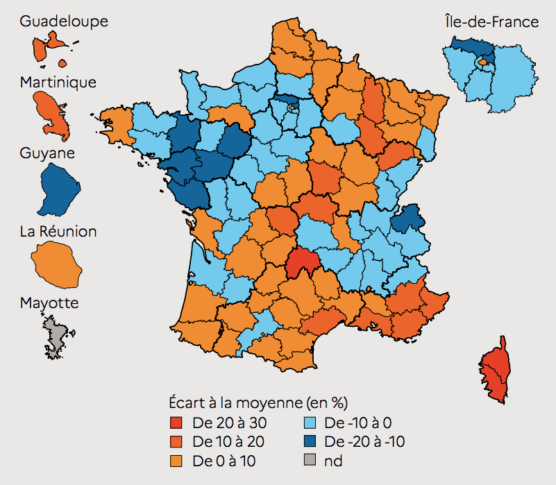 Plus globalement, toujours la même année, les dépenses moyennes les plus élevées se situent dans les départements ruraux du centre et du nord-est ainsi qu’en Provence-Alpes-Côte d’Azur, en Martinique et en Guadeloupe, alors que les plus faibles se trouvent dans le quart nord-ouest de la France métropolitaine, en Rhône-Alpes, et en Île-de-France.