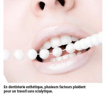 L’excellente vision de la luminosité de la dent, de sa forme et son opalescence, de son état de surface, de sa couleur, est le facteur de réussite. Et en cas d’utilisation de composites, la photopolymérisation doit être la plus retardée possible. Tous ces facteurs plaident pour un travail sans scialytique en pure lumière du jour D65. Le scialytique reste néanmoins incontournable en fond de bouche, zones palatines, etc.