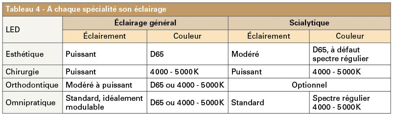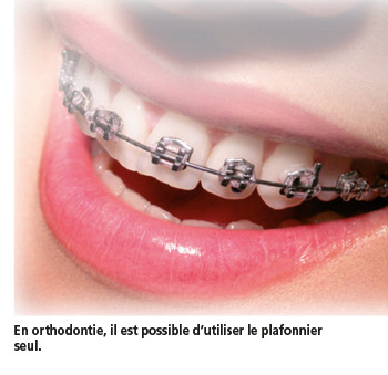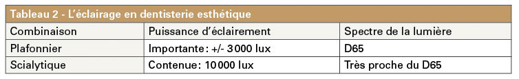 Les performances du plafonnier doivent permettre de se suffire pour le travail sur les faces vestibulaires des dents du bloc antérieur. Le scialytique sert en assistance dans le secteur postérieur (tableau 2).
