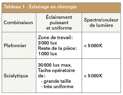 Le second paramètre doit être nuancé, car il est faux que la chirurgie nécessite beaucoup plus d’éclairement que la dentisterie. Une quantité de lumière supérieure est certes nécessaire, mais elle doit être contenue pour éviter les éblouissements.