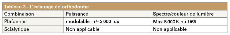 La nature des actes effectués même en fond de bouche permet d’utiliser le seul plafonnier, de très haute qualité, au lieu de la combinaison plafonnier/scialytique. Avantage collatéral non négligeable : à puissance d’éclairement moins élevée (puisqu’il n’y a pas de scialytique), les colles photo démarrent leur photopolymérisation moins rapidement (tableau 3).