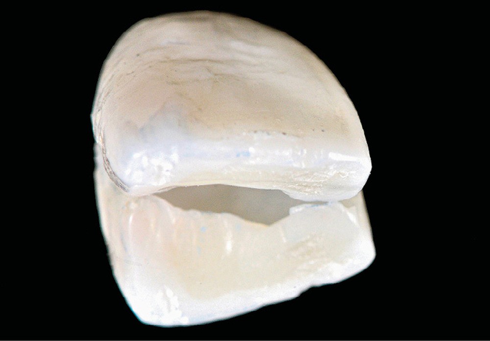 2. Le mock-up peut être réalisé à partir d’un wax-up fait par le praticien ou le prothésiste sur des répliques coulées d’empreintes surfaciques réalisées en bouche. Le praticien peut alors faire un guide en silicone pour transférer le wax-up en bouche [3]. Avec un silicone transparent, le masque peut être réalisé en composite fluide injecté et photopolymérisé à travers le silicone. Avec un silicone traditionnel pour empreinte en double mélange, le masque doit être réalisé en résine chémopolymérisalble. Certains utilisent aussi une gouttière thermoformée stabilisée par un silicone de laboratoire rigide pour réaliser le masque en résine. Quel que soit le matériau, ce premier masque peut être modifié par une technique cut-back composite pour améliorer l’esthétique.
