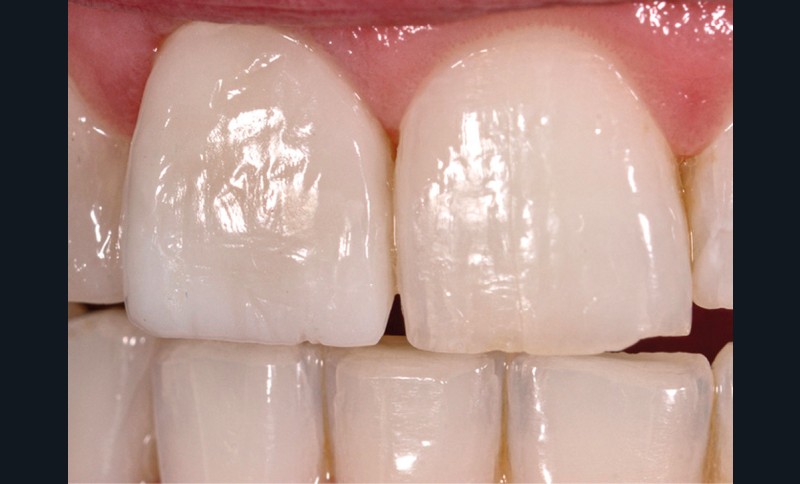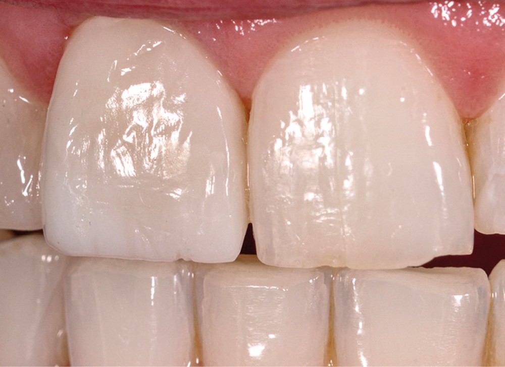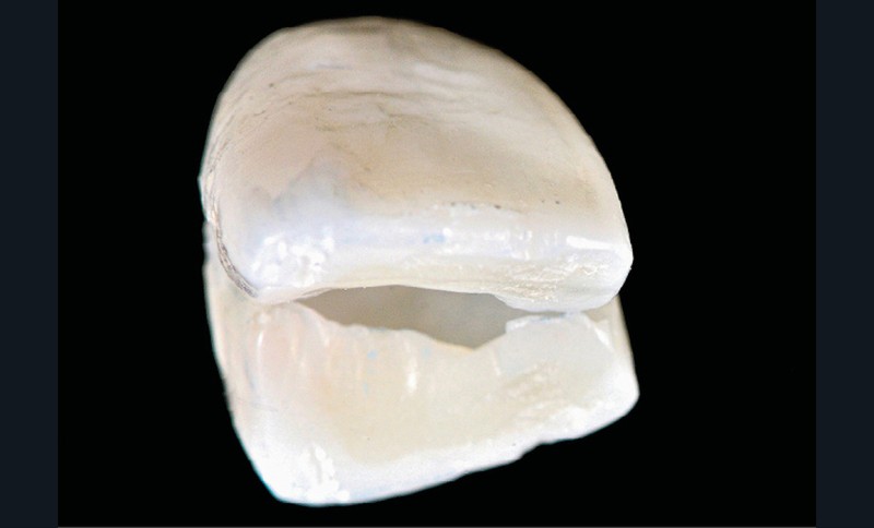 Le collage demande rigueur et application. Tout commence par le choix de la colle [6]. Si de nombreuses colles existent sur le marché, notre choix se recentre sur des colles sans potentiel adhésif, des colles universelles, et des composites fluides. Ces matériaux assurent une esthétique parfaite du joint de collage et, au-delà de la force d’adhésion immédiate (mise en évidence dans les batailles de l’adhésion) [7], une adhésion en bouche assurant la pérennité de la restauration. Lors de cette étape, il est indispensable de respecter les protocoles de mise en œuvre, en tenant compte aussi de la nature des céramiques utilisées qui justifie certaines variantes de protocoles [8]. Si le collage renforce la résistance de l’élément prothétique et de la dent, il faut être particulièrement attentif à la qualité et à la vitesse de polymérisation. Une photopolymérisation trop rapide risque, par le retrait de prise du matériau de collage, de provoquer des fêlures de la facette de faible épaisseur, et ne permettra pas d’enlever facilement les excès de colle.