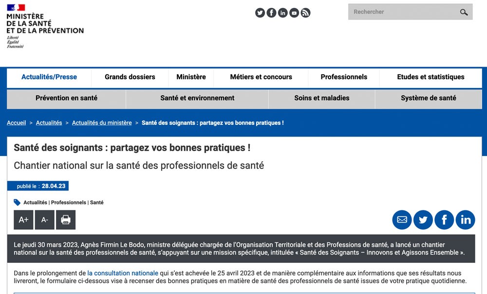 Dans le prolongement de la consultation nationale visant à objectiver la relation des professionnels de santé à leur santé (temps de travail, sommeil, stress, alimentation, etc.) qui s’est achevée le 25 avril dernier (lire Id n° 16), le ministère de la Santé diffuse sur son site internet un formulaire visant à recenser les bonnes pratiques en matière de santé issues des initiatives mises en place au quotidien par les professionnels de santé. « Vous avez une idée d’action ? Vous portez un projet ? Votre initiative améliore concrètement la santé des soignants ? Cet espace est fait pour vous ! », indique le site (https://bit.ly/3LqOMBg). Les contributions seront transmises à la mission « Santé des Soignants – Innovons et Agissons Ensemble » et permettront de « co-construire la démarche innovante visant à améliorer la santé des professionnels de santé, en lien avec les différents acteurs engagés sur le sujet ».