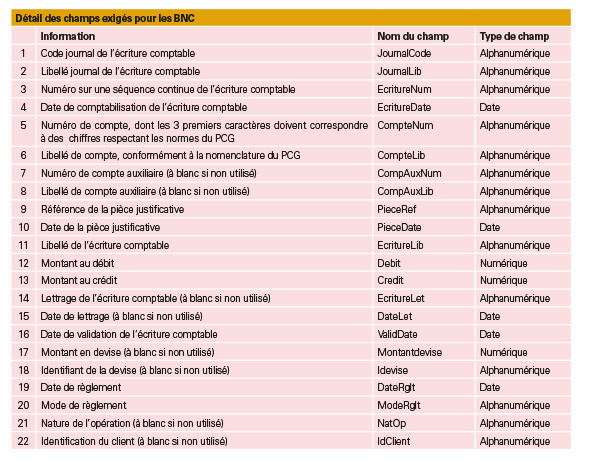Le tableau ci-dessous présente le détail de chacun des vingt-deux champs exigés pour les BNC.