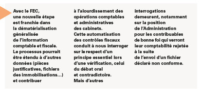 Pour les vérifications dont l’avis est adressé à partir du 1er janvier 2014, les contribuables doivent obligatoirement présenter le FEC, avec un contenu et une structure bien définis. Ce fichier permettra à l’Administration d’effectuer des tris, des classements, des calculs, et de reconstituer les montants portés sur la 2 035.