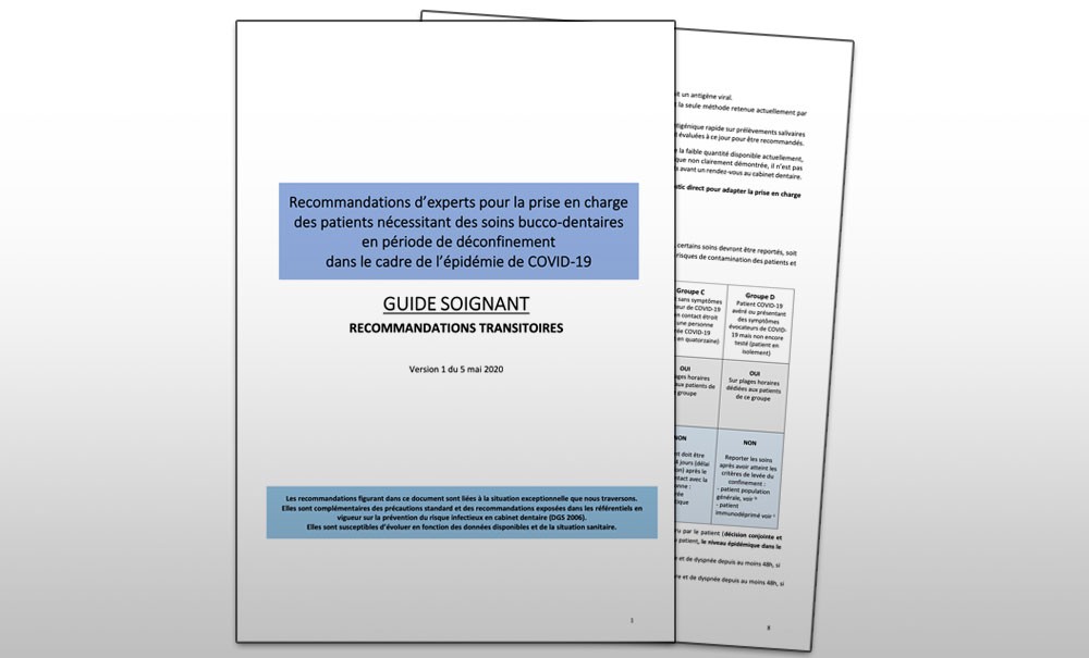 L’Ordre des chirurgiens-dentistes a publié le 23 juillet, la version 3 des « Recommandations d’experts pour la prise en charge des patients nécessitant des soins bucco-dentaires en période de déconfinement dans le cadre de l’épidémie de Covid-19 ». Les groupes de patients restent inchangés. On note quelques évolutions mineures comme l’utilisation de la climatisation à plus faible vitesse possible, « sans diriger le flux d’air vers la zone de soins et en assurant un apport d’air neuf régulier » ou, pour le nettoyage des sols, l’utilisation d’un détergent-désinfectant habituel en lieu et place d’un produit virucide (EN 14 476).