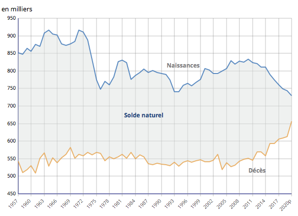 L’année dernière, 740 000 bébés seulement sont nés en France. En recul depuis 2015, la fécondité s’établit à 1,84 enfant par femme en 2020, seuil le plus bas depuis 1957. Dans le même temps, 658 000 personnes sont décédées en France, soit 7,3 % de plus qu’en 2019 en raison de pandémie de Covid-19.