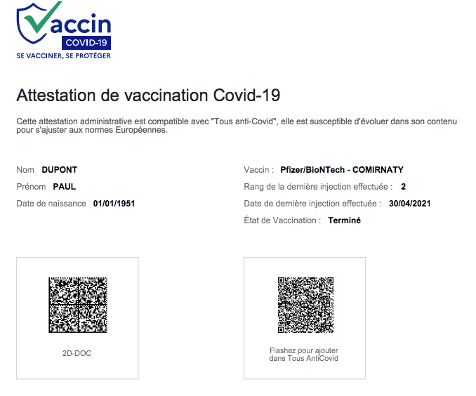 Cette nouvelle attestation de vaccination comprend un QR Code à scanner pour stocker ce document dans l’application TousAntiCovid onglet « Carnet ». Ceux qui sont déjà vaccinés recevront automatiquement dans la deuxième quinzaine de mai leur attestation sur ce même support. Pour l’instant cette attestation numérique, authentification unique et officielle des certificats de tests et de vaccination, ne sert pas à grand-chose mais pourrait devenir fort utile dans les prochaines semaines en se transformant en « Pass sanitaire ».