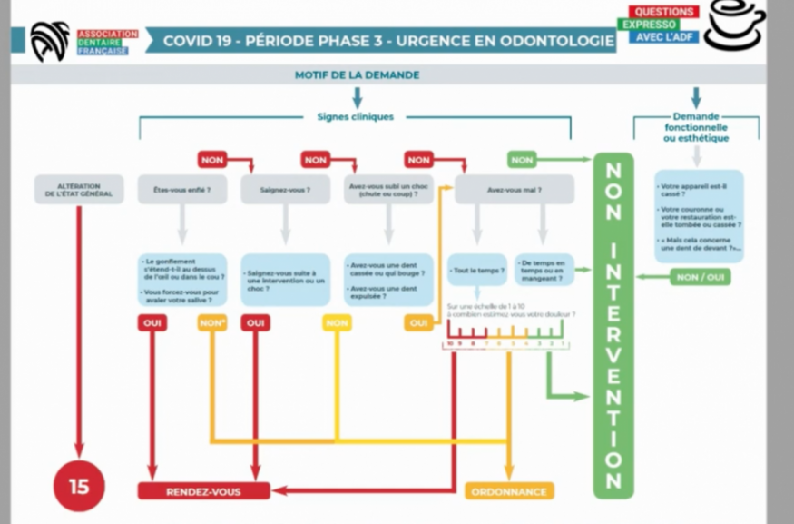 Il est revenu sur la régulation des urgences en explicitant l’arbre décisionnel déjà publié par l’ADF (voir ci-dessous). Il permet au praticien d’aiguiller au téléphone son patient en fonction de ses symptômes, soit vers le dispositif de garde mis en place par les CDO, soit en lui prodiguant quelques conseils et lui fournissant une ordonnance, soit en intervenant pas.