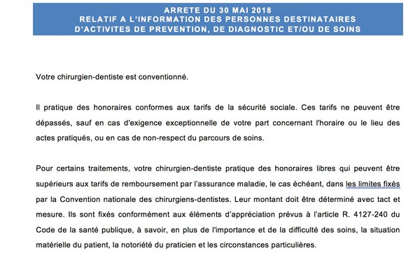 • Pour les prestations hors convention : « Votre chirurgien-dentiste doit obligatoirement vous informer avant de réaliser un acte non remboursé par la Sécurité sociale. En outre, dès lors que les dépassements d’honoraires des actes et prestations facturés atteignent 70 euros, votre professionnel doit vous en informer par écrit, préalablement à la réalisation de la prestation. »