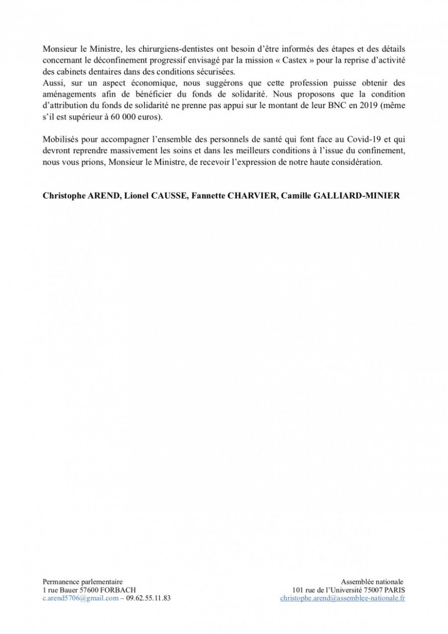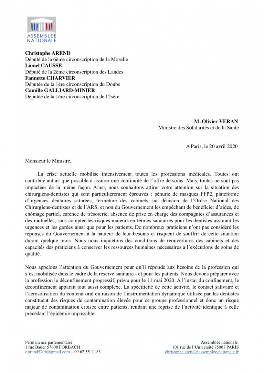 Dans une lettre adressée à Olivier Véran le 20 avril, quatre députés LaRem, dont Christophe Arend, député de la 6éme circonscription de la Moselle et chirurgien-dentiste, « appellent l’attention du gouvernement » pour qu’il réponde aux besoins de la profession dentaire et prépare au mieux son déconfinement progressif à partir du 11 mai en les informant « en détail » des mesures prises.