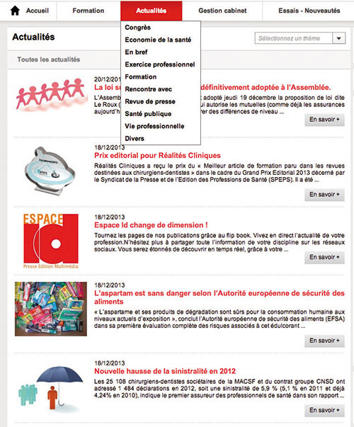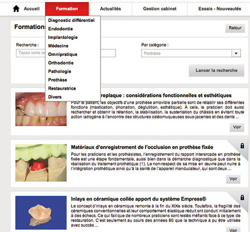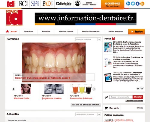 La formation est « la » raison d’être des publications du groupe Espace id (L’Information Dentaire, Réalités Cliniques, Stratégie Prothétique, L’Orthodontiste, Profession Assistante Dentaire). Elle est mise en avant dès la page d’accueil du site. Retrouvez par discipline tous les articles de formation parus depuis dix ans, soit au format PDF, soit en lecture dynamique à l’écran, agrémentés de diaporamas/vidéos.