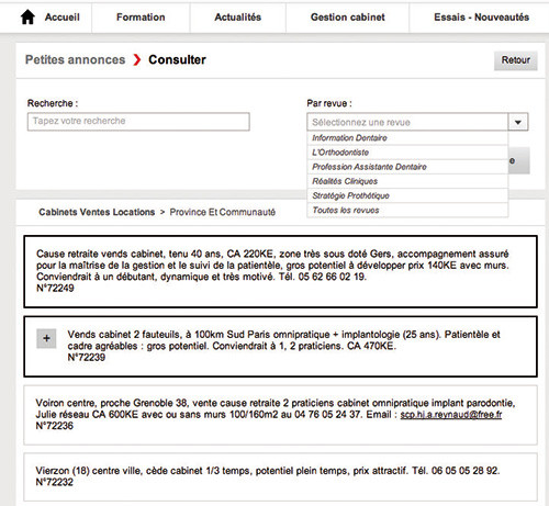 Pour vous être utiles, les petites annonces (emplois, ventes de cabinets…) sont accessibles dès la page d’accueil. Vous pouvez rechercher par mots clés et par publications.