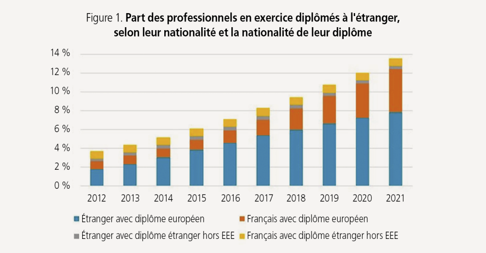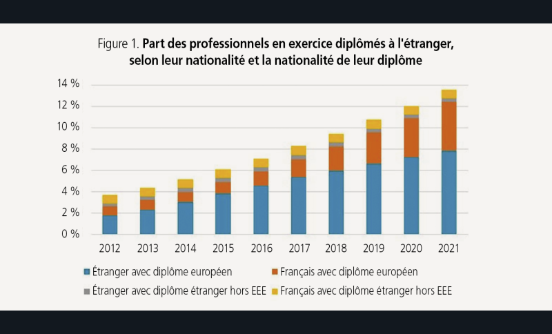 Ensuite l’arrivée sur le territoire national de praticiens français ou européens diplômés dans d’autres pays d’Europe. « Le nombre de chirurgiens-dentistes français en exercice, diplômés hors de France mais en Europe, a explosé entre 2012 et 2021, passant de près de 350 à quasiment 2 000, soit une multiplication par près de 6 », indique la Drees. Quant aux praticiens de nationalité étrangère détenant un diplôme européen : ils sont aujourd’hui plus de 3 300, soit pratiquement 5 fois plus qu’en 2012.