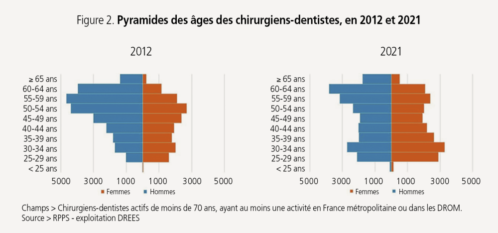 L’âge moyen des praticiens a diminué de 2,4 ans depuis 2012 pour atteindre 45,8 ans de moyenne d’âge aujourd’hui. Et alors que les femmes représentaient en 2012 à peine 40 % des effectifs elles sont près de la moitié désormais (48 %). « Majoritairement masculines, les générations les plus nombreuses en 2012 ont pour une large partie pris leur retraite aujourd’hui et ont été remplacées par des promotions plus équilibrées en termes de genre, puis majoritairement féminines », explique la Drees. Ainsi, en 2021, les dentistes de 50 ans ou plus sont majoritairement des hommes, mais 50 % des dentistes âgés de 45 à 49 ans sont des femmes, et la féminisation atteint près de 55 % pour les 30 à 34 ans.