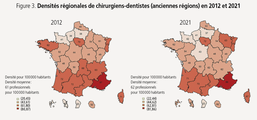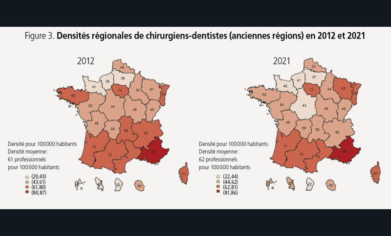 De 2012 à 2021 : rien a changé en termes de répartition géographique des chirurgiens-dentistes. Leur densité est plus importante dans la moitié sud de la France (à l’exception de la Corse), où elle dépasse 70 chirurgiens-dentistes pour 100 000 habitants. Elle est ainsi particulièrement élevée par exemple en PACA (86 pour 100 000).