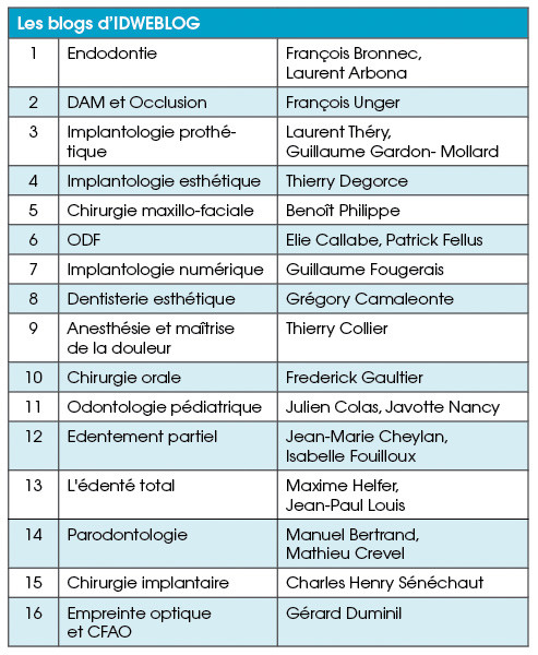 Depuis deux ans donc, Idweblogs met en ligne chaque jour des posts (articles) dédiés à la formation continue en odontologie. Le mouvement inauguré par la mise en ligne de 4 blogs (revues numériques) s’est poursuivi depuis : le site propose aujourd’hui 16 blogs consacrés aux différents aspects de la chirurgie dentaire.
