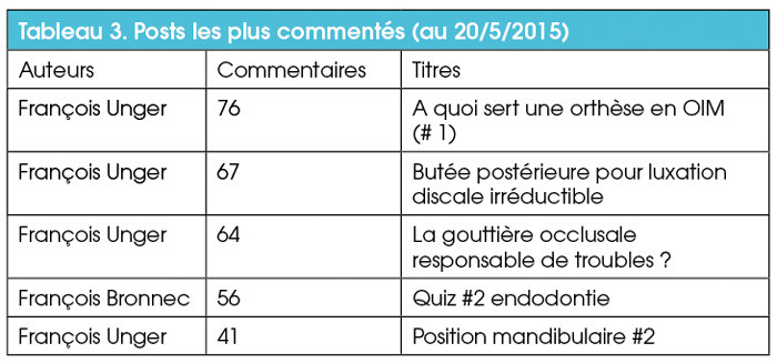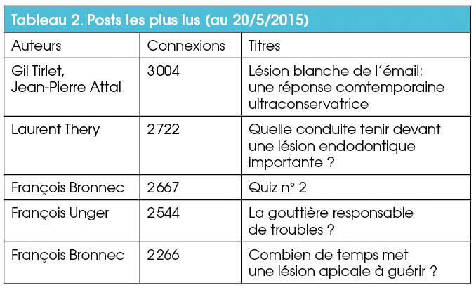 Nous avons aussi, grâce aux outils statistiques de notre logiciel propre, un accès immédiat et permanent aux indicateurs objectivant l’intérêt que suscite tel ou tel post : les plus lus ou les plus commentés par exemple : la dentisterie esthétique, l’implantologie, l’endodontie et l’occlusodontologie (où les discussions objectivent les incertitudes scientifiques) offrent les posts les plus régulièrement consultés. Mais en fait, les posts restant indéfiniment en ligne et accessibles d’un clic, la plupart des posts sont lus par plus de 2000 internautes (tableaux 2 et 3).