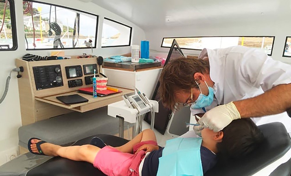 Le bateau Océan Dentiste, équipé d’un fauteuil dentaire, va de port en port, s’arrête dans les écoles pour faire de la prévention. Après 11 pays visités et plus de 8 000 enfants sensibilisés dans 65 villes, il veut repartir à l’aventure.