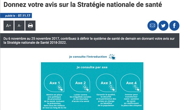 Depuis le 6 novembre, vous pouvez donner votre avis sur les objectifs et les priorités du projet de stratégie nationale de santé 2017-2022. Cette consultation publique, souhaitée par le ministère de la Santé, prendra fin le 25 novembre.